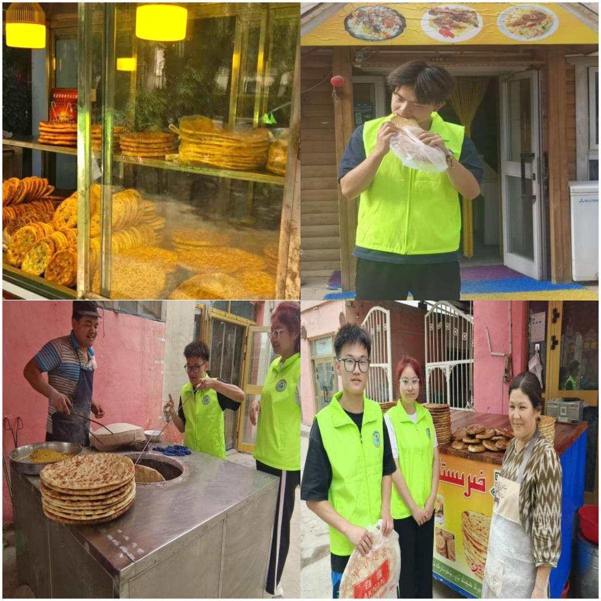 走进馕文化。馕作为新疆特色美食的代表,其制作技艺入选第五批国家级非物质文化遗产代表性项目名录,是新疆地区招待客人的必备美食。志愿队成员们首先来到了市场的馕售卖商店,大家开始品尝不同种类的馕,馕的种类繁多,口味各有千秋。随后,大家走到馕坑旁,观察并亲身体验馕的制作过程,切身体会新疆特色传统制作手艺,并详细了解馕文化的起源与发展。