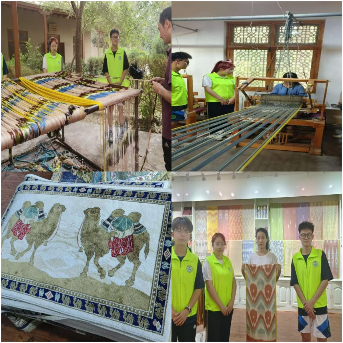 艾德莱丝绸作为吉亚乡传统手工业,距今已有3000多年的生产历史,至今仍保留着古代植物扎染技术和木制自造织绸机器,有效保护了非物质文化遗产的传承。志愿队成员们来到吉亚丽人艾德莱丝绸有限责任公司,跟随手工艺师傅们全面了解艾德莱丝绸工艺的制作流程,认真倾听手艺人讲述艾德莱丝绸的制作技巧、发展脉络以及丝绸工艺的传承与创新。